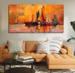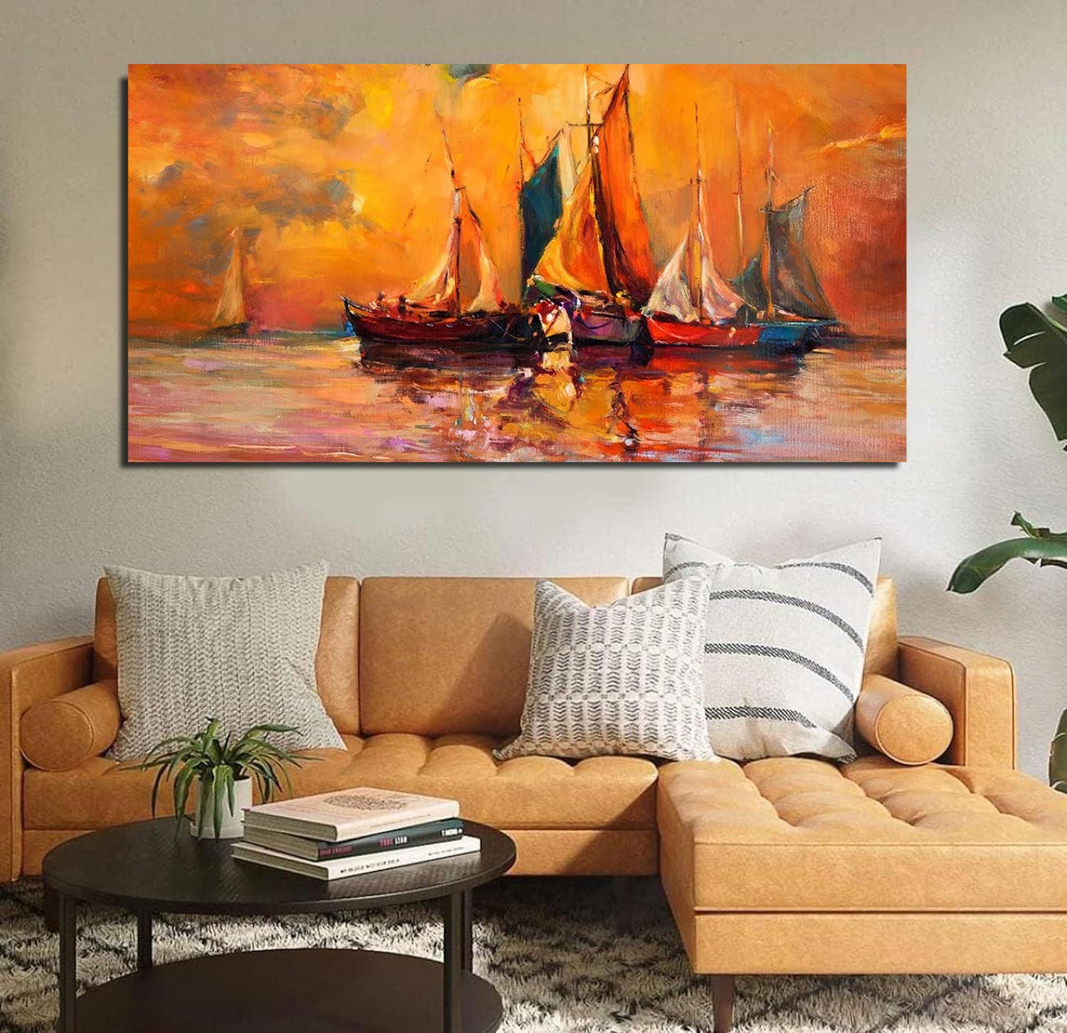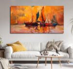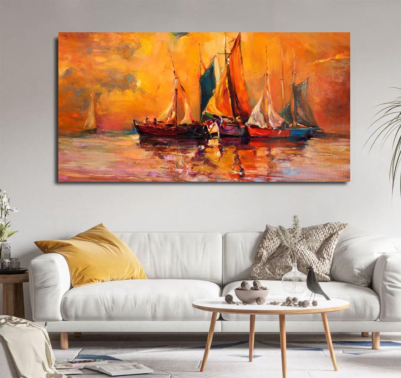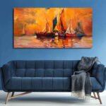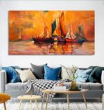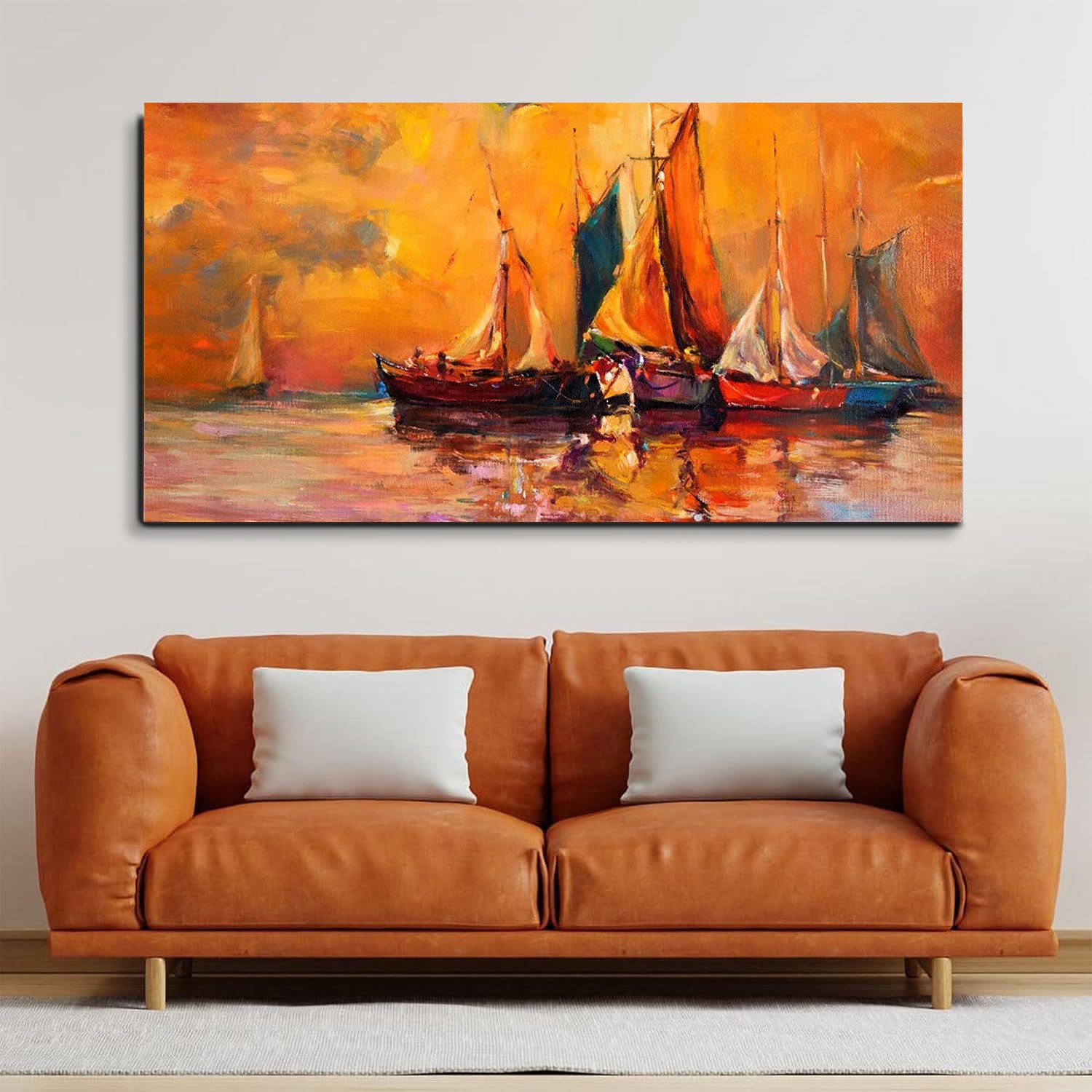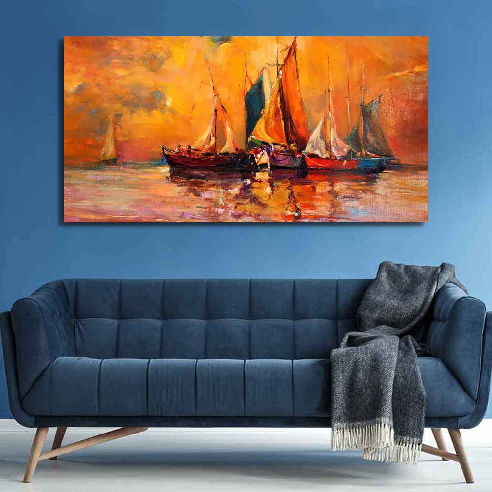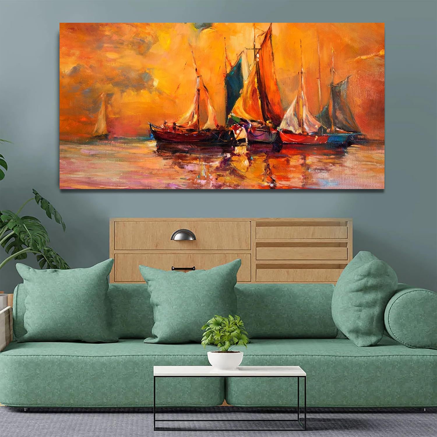 Beautiful Boats and Ocean in Red seascape Canvas Wall Painting.