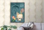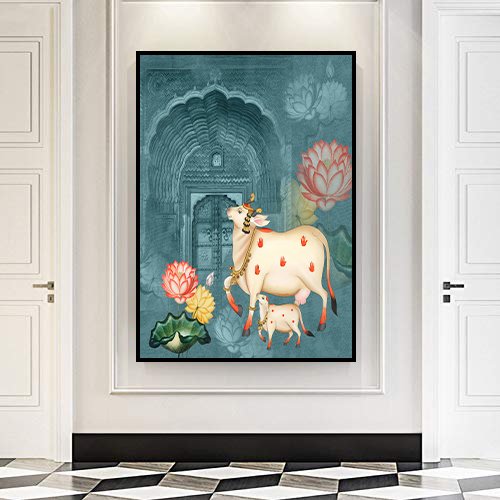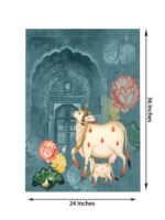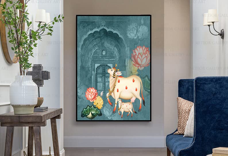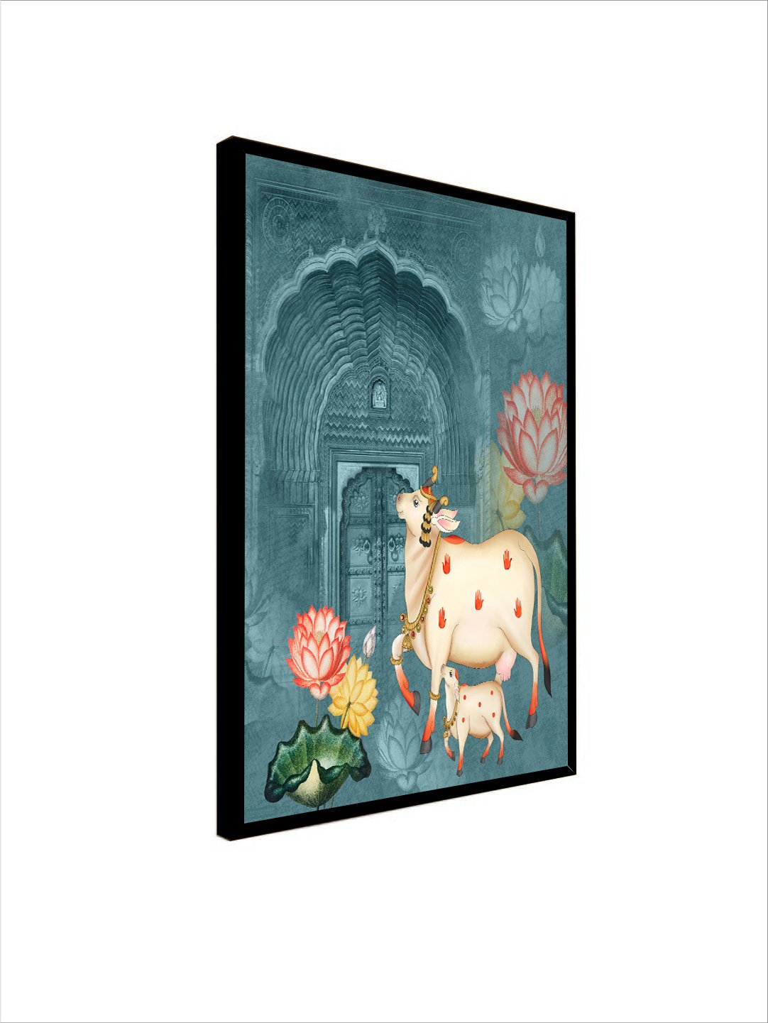 Beautiful Cow and Calf with lotus motifs wall art Floating Frame Canvas