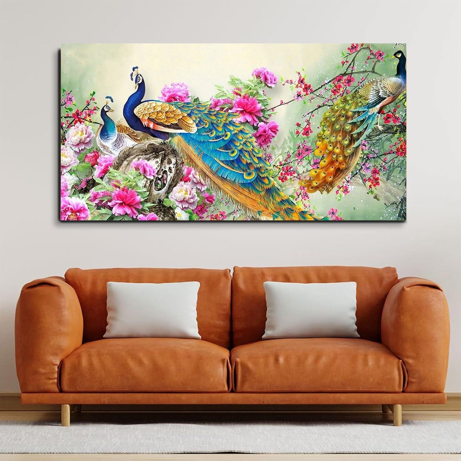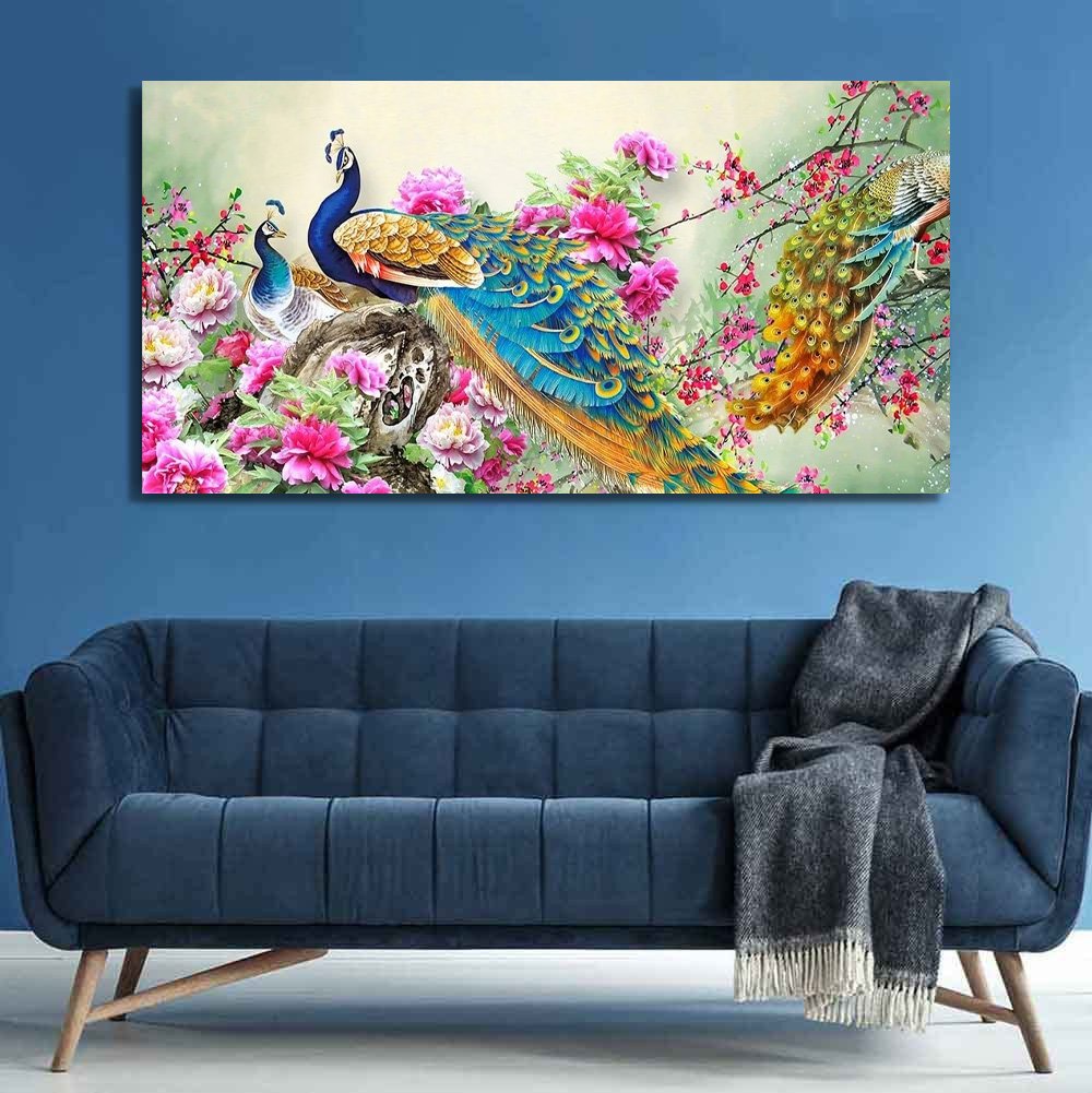Beautiful Vibrant Peacock And Flower Nature Landscape Canvas Wall Painting