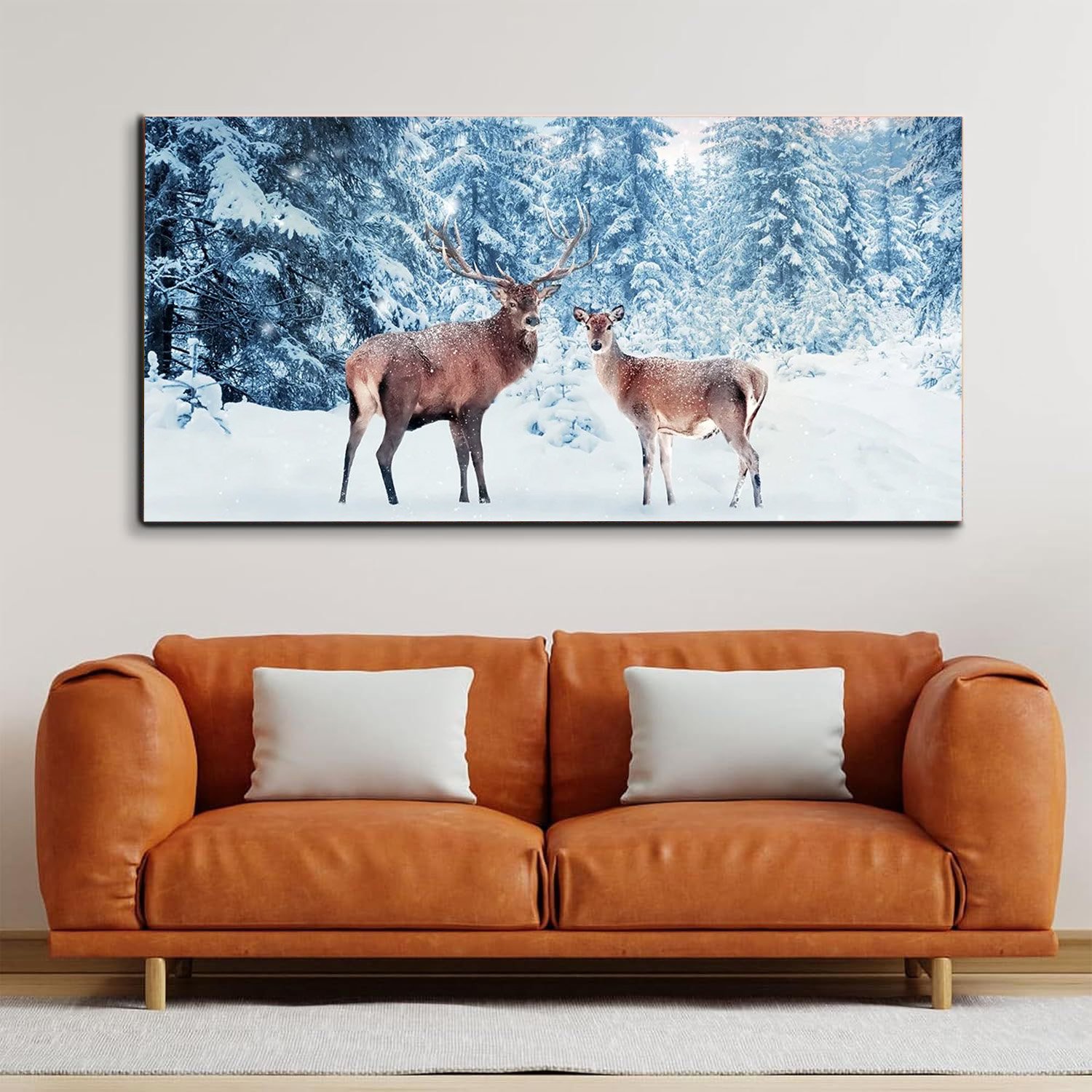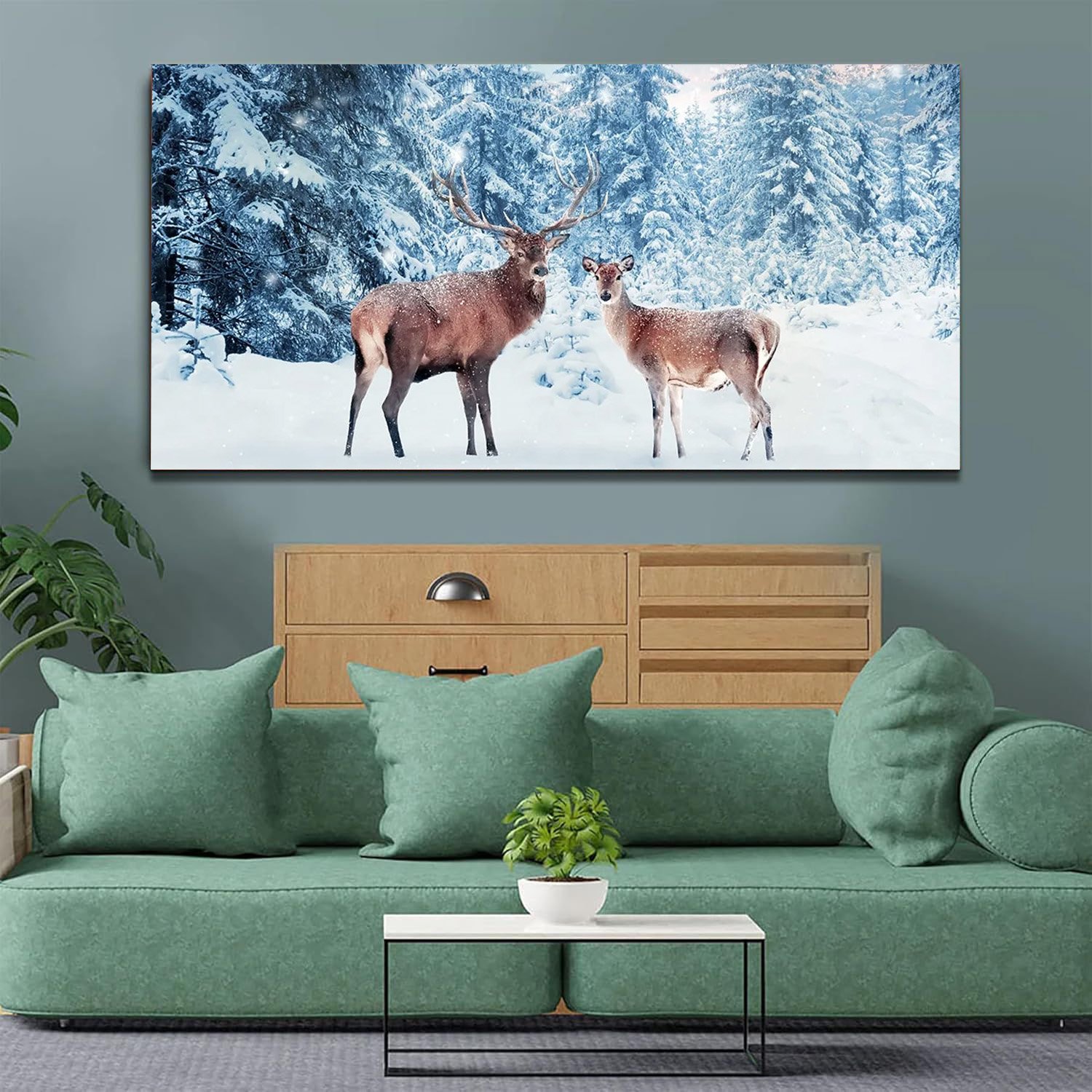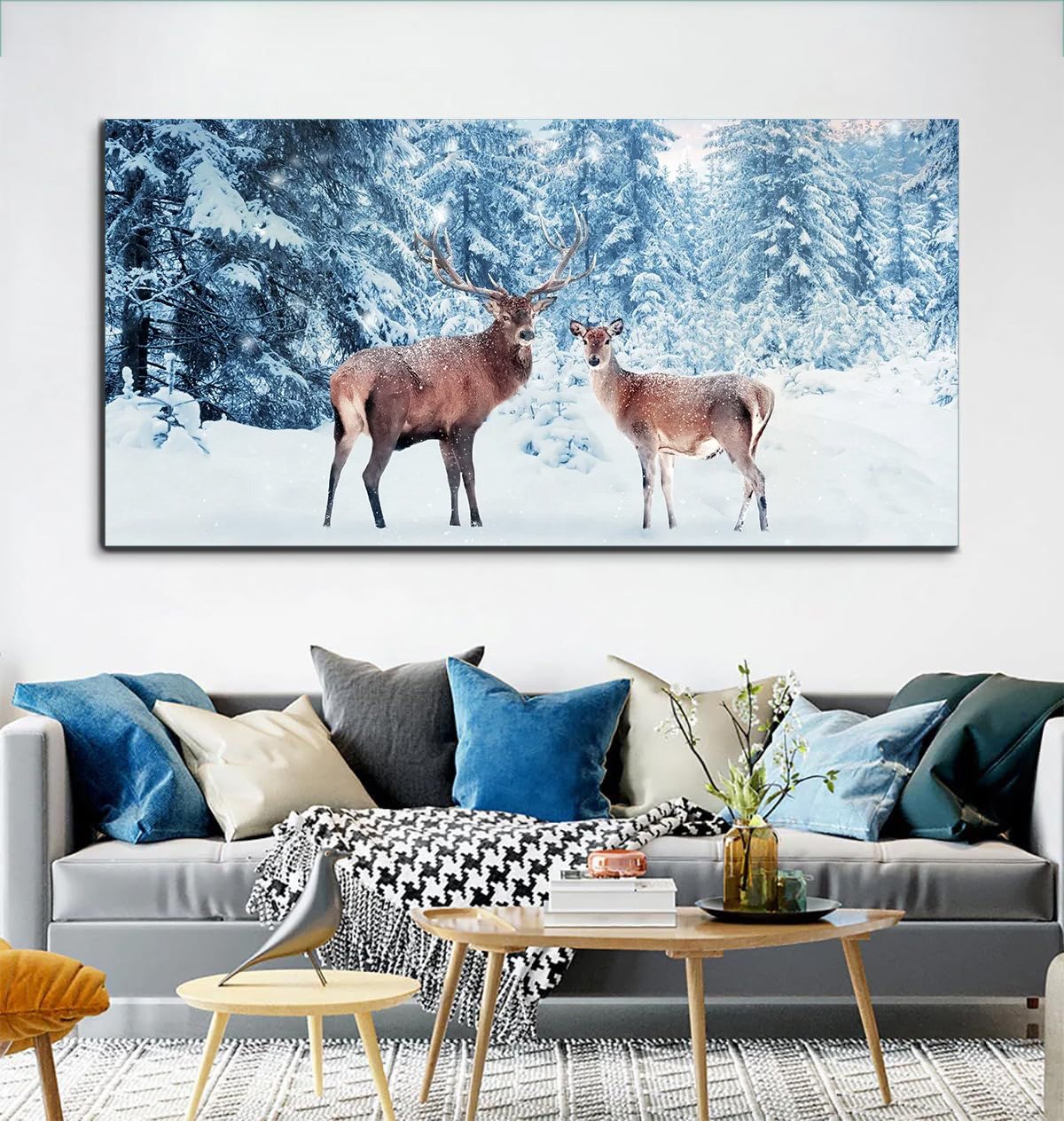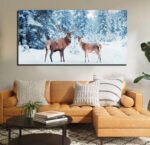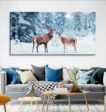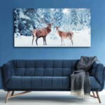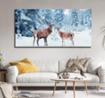 Family of noble deer in a snowy winter forest at sunsetCanvas Wall Painting.