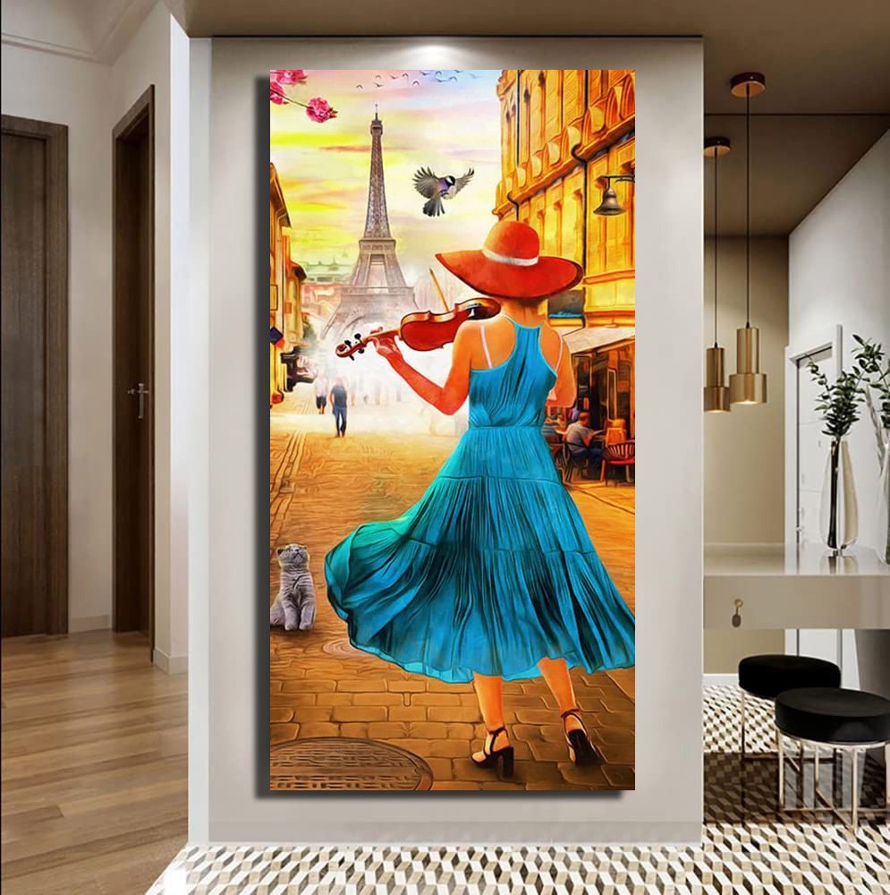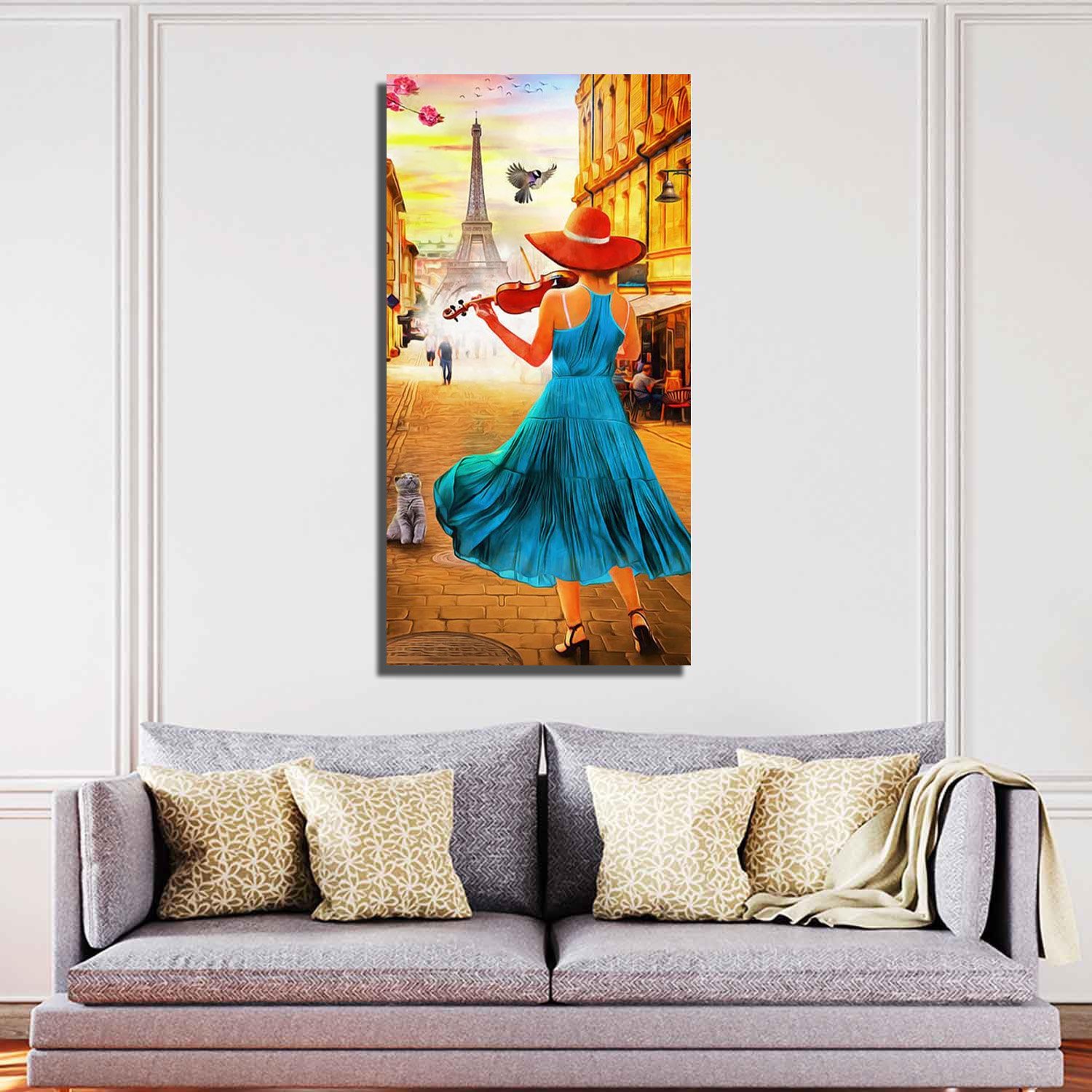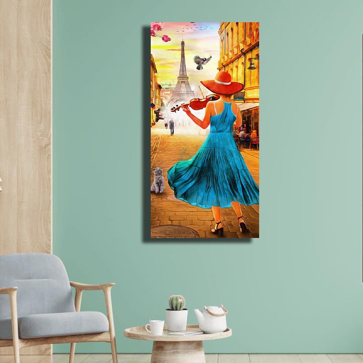 Girl Playing the Violin and Eiffel Tower Canvas Wall Painting.