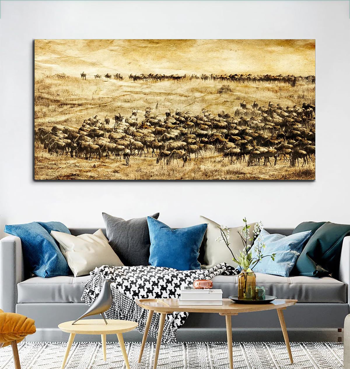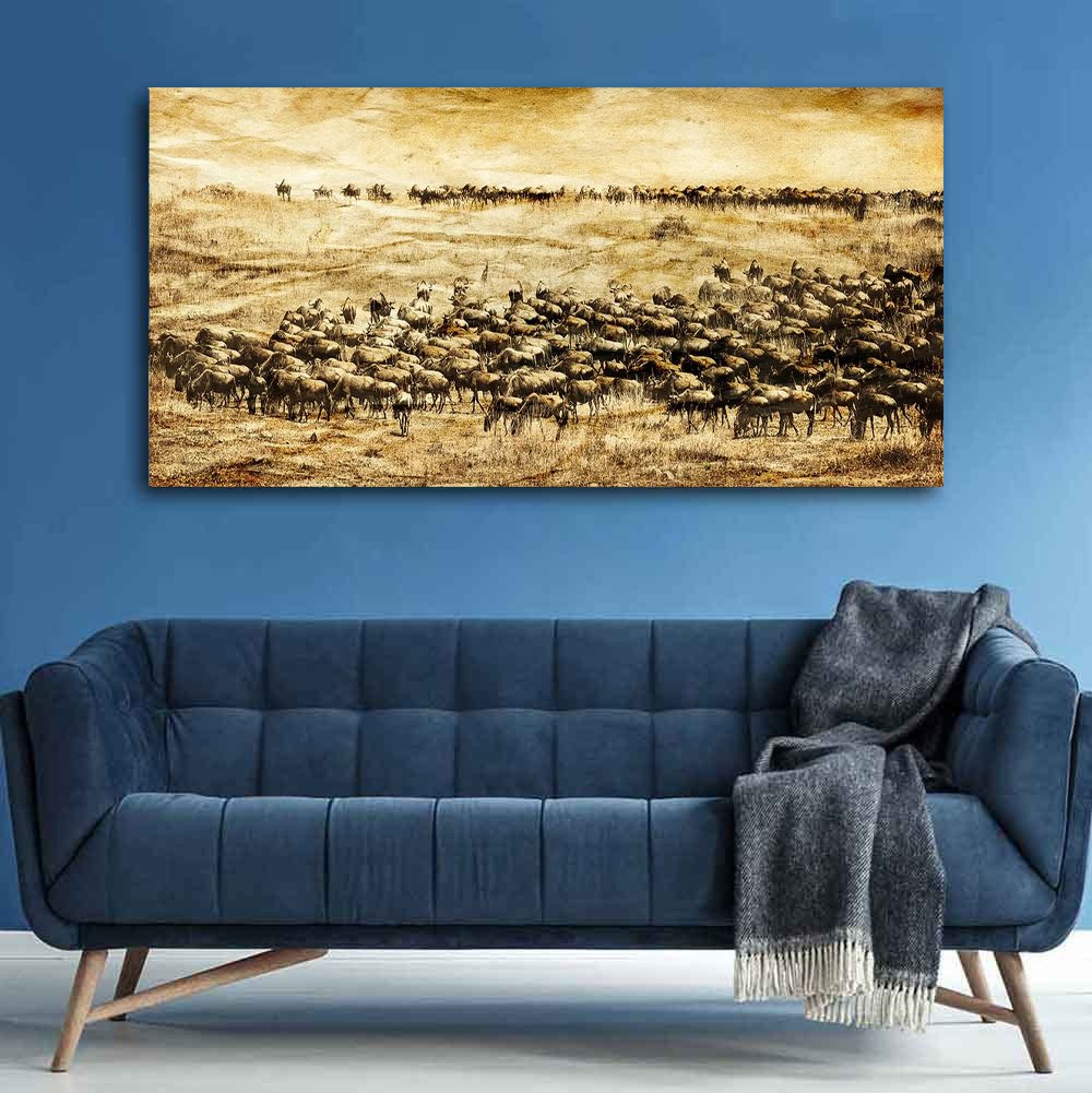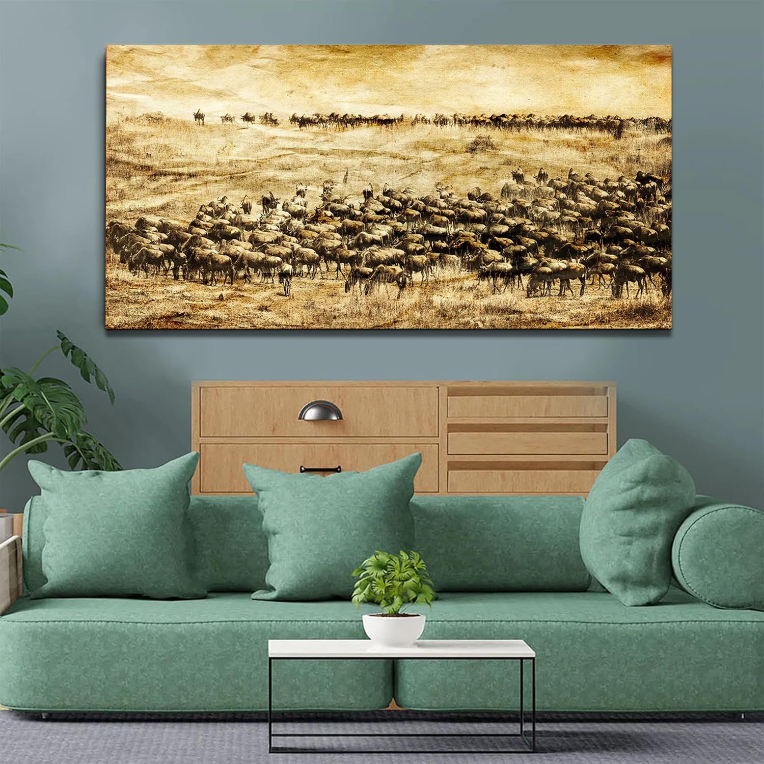 • Great Wildebeest Migration in a vintage, sepia-toned style Canvas Wall Painting.