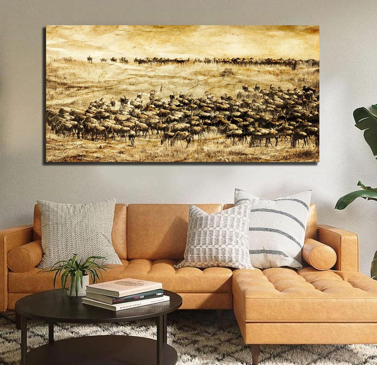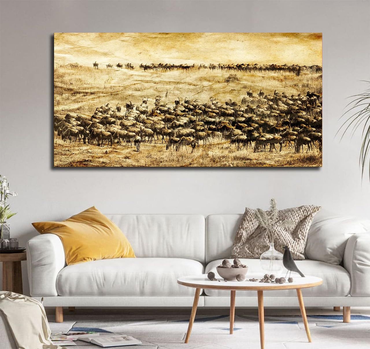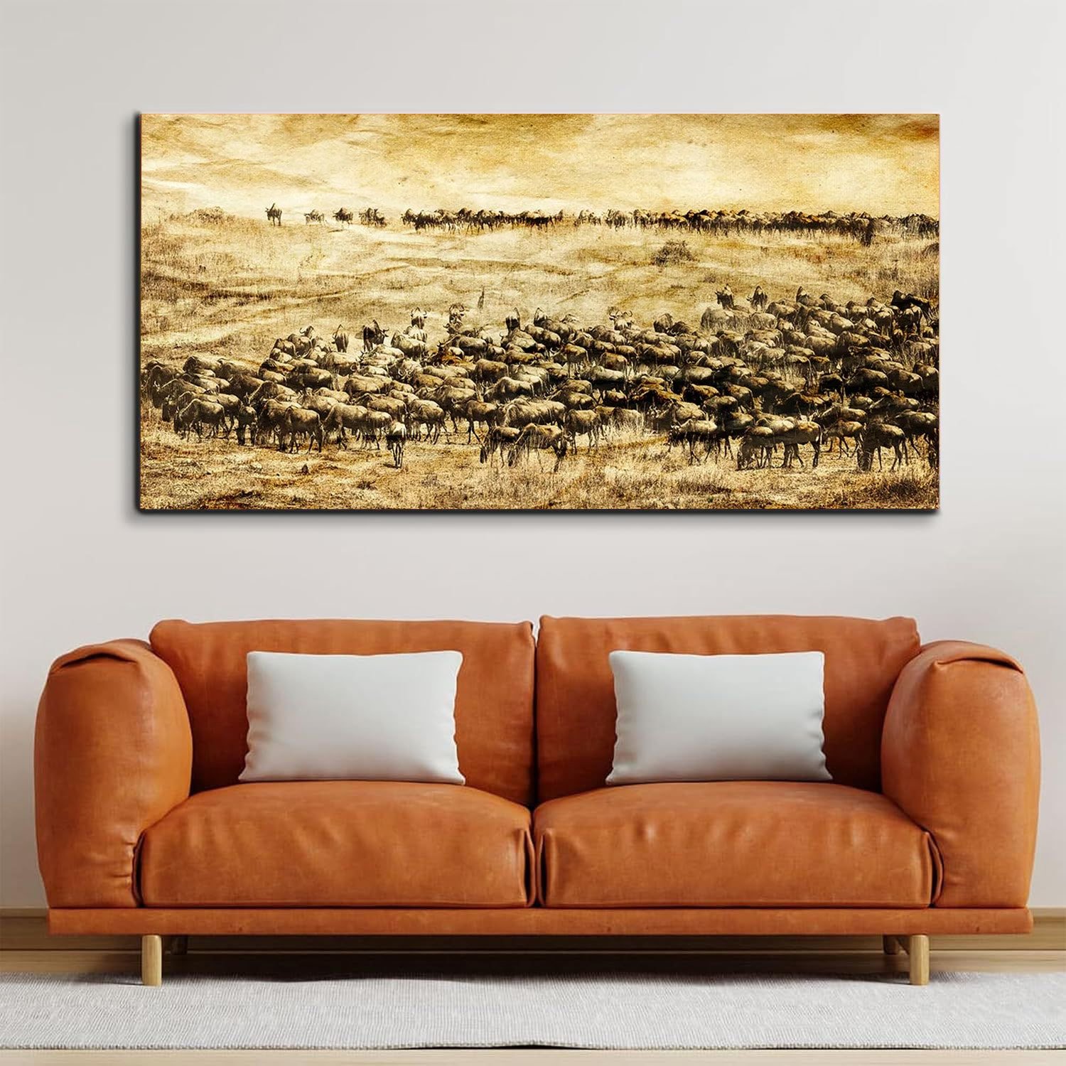 • Great Wildebeest Migration in a vintage, sepia-toned style Canvas Wall Painting.