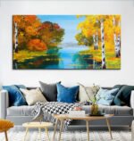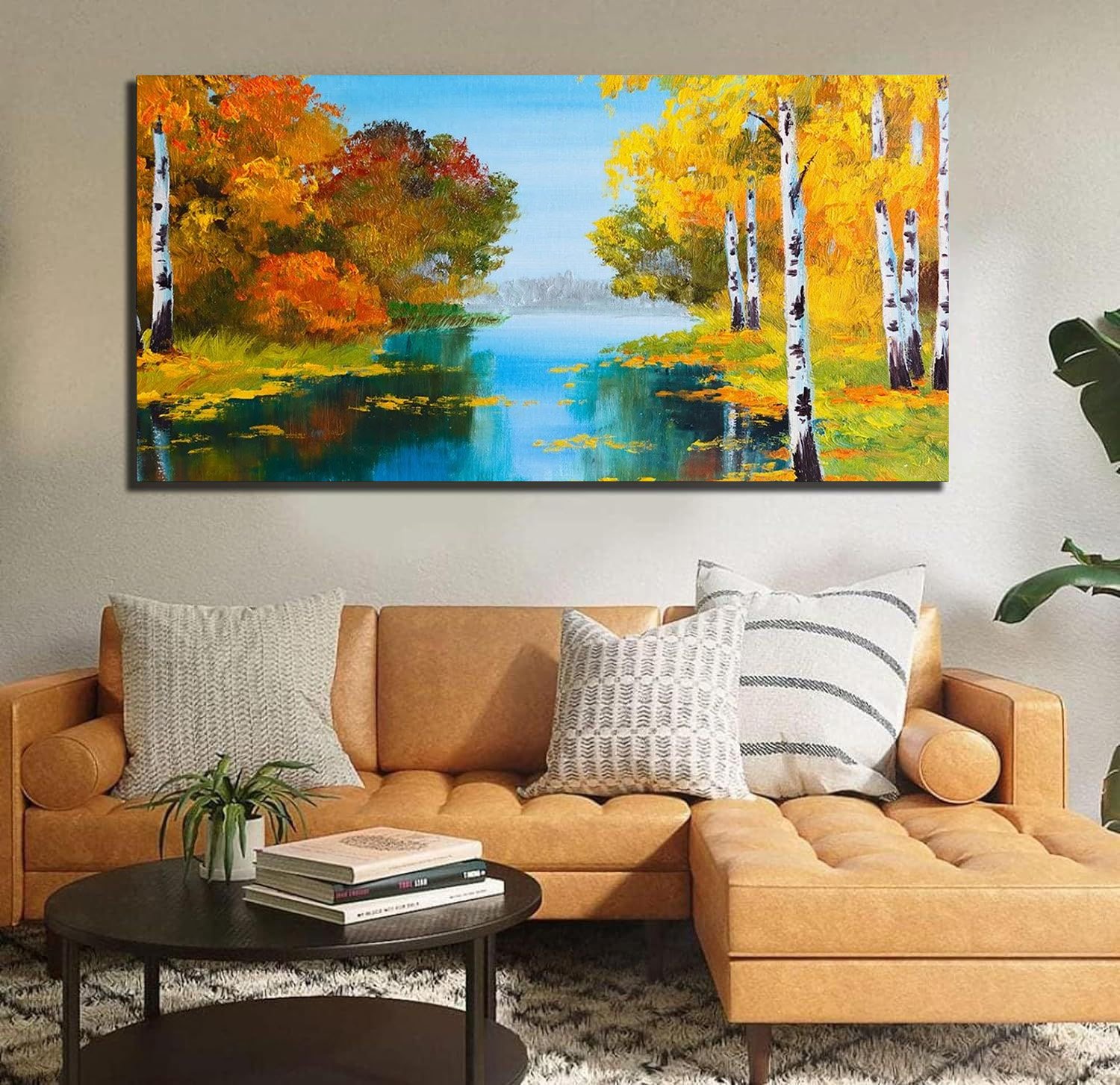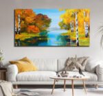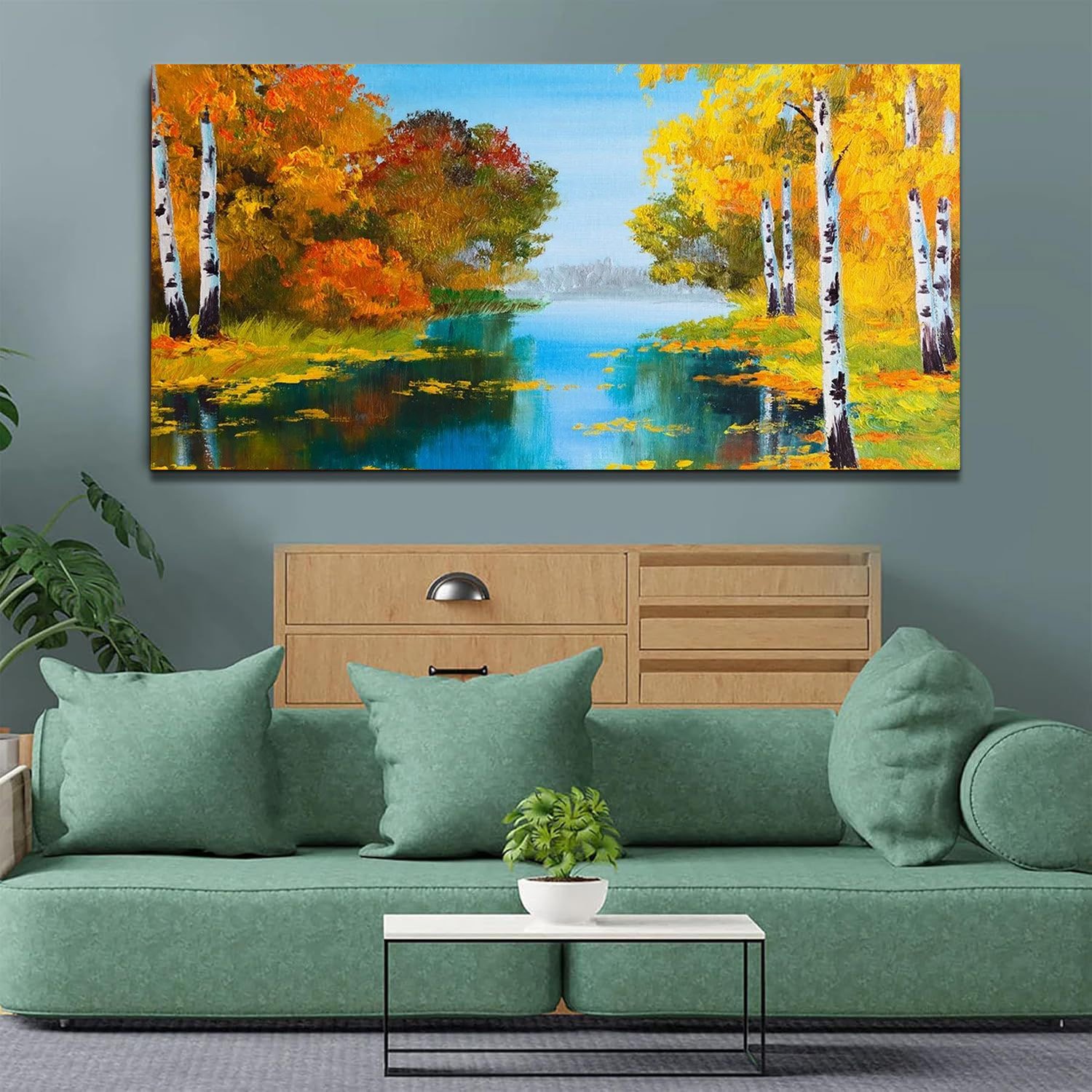 Serene autumn scene with a river reflecting vibrant trees Canvas Wall Painting.